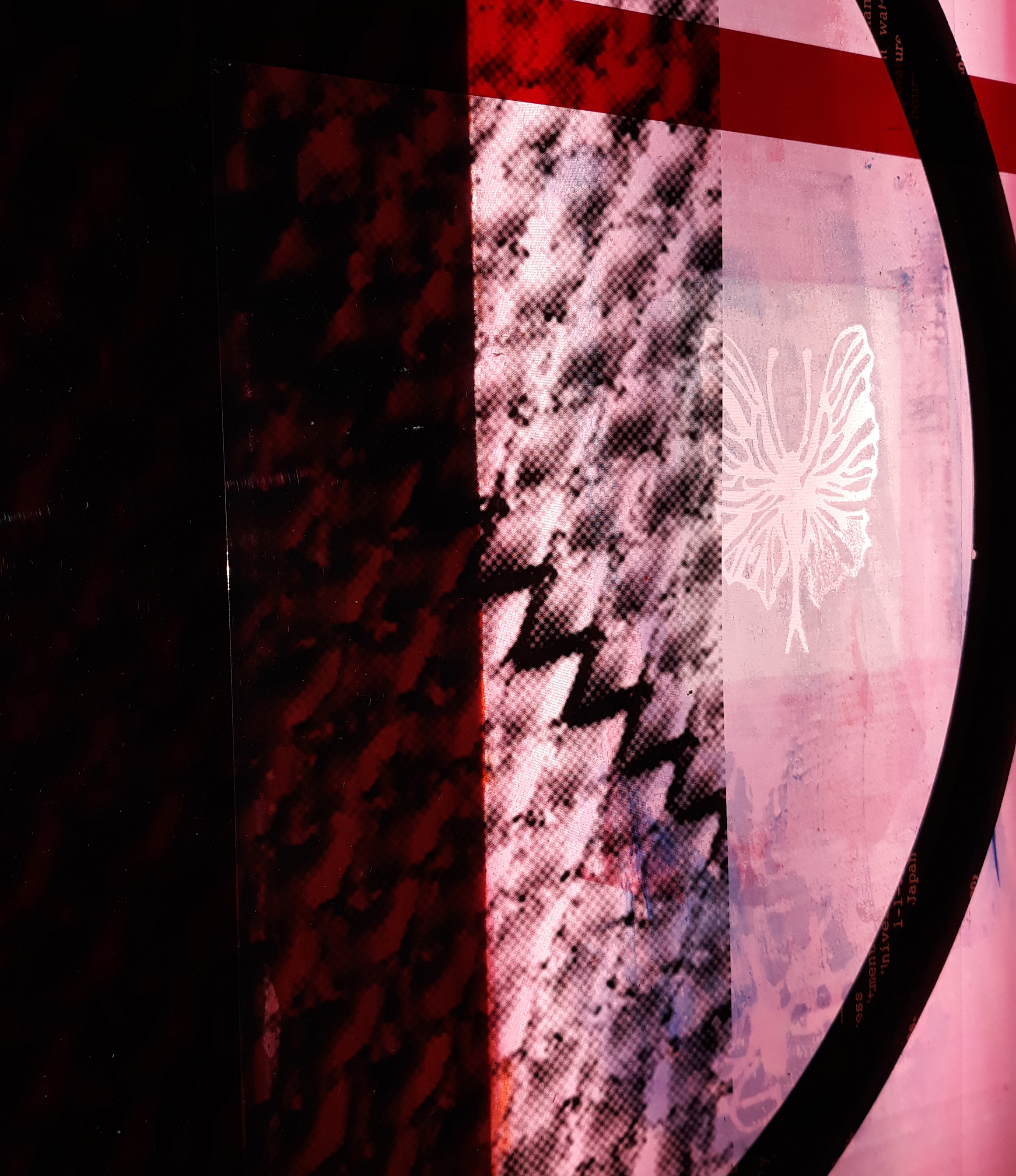 In meinen Leuchtkästen mit dem Titel PLACES arbeite ich mit transparenten Materialien. Folien werden übereinandergeschichtet. Das heißt, es sind analog geklebte Collagen (und nicht am Computer erstellte Digital-Collagen), die hinterleuchtet sind. Die Schichtung der Folien erzeugt teilweise ein Moiré, bzw. eine Tiefe. Das Schwarz „schwärzt“. Der Titel der im Spannungsfeld zwischen körperlicher und digitaler Raumerfahrung angesiedelten Reihe weist auf konkrete Orte hin und „zeigt“ sie auf sowohl transparente als auch intransparente Art.